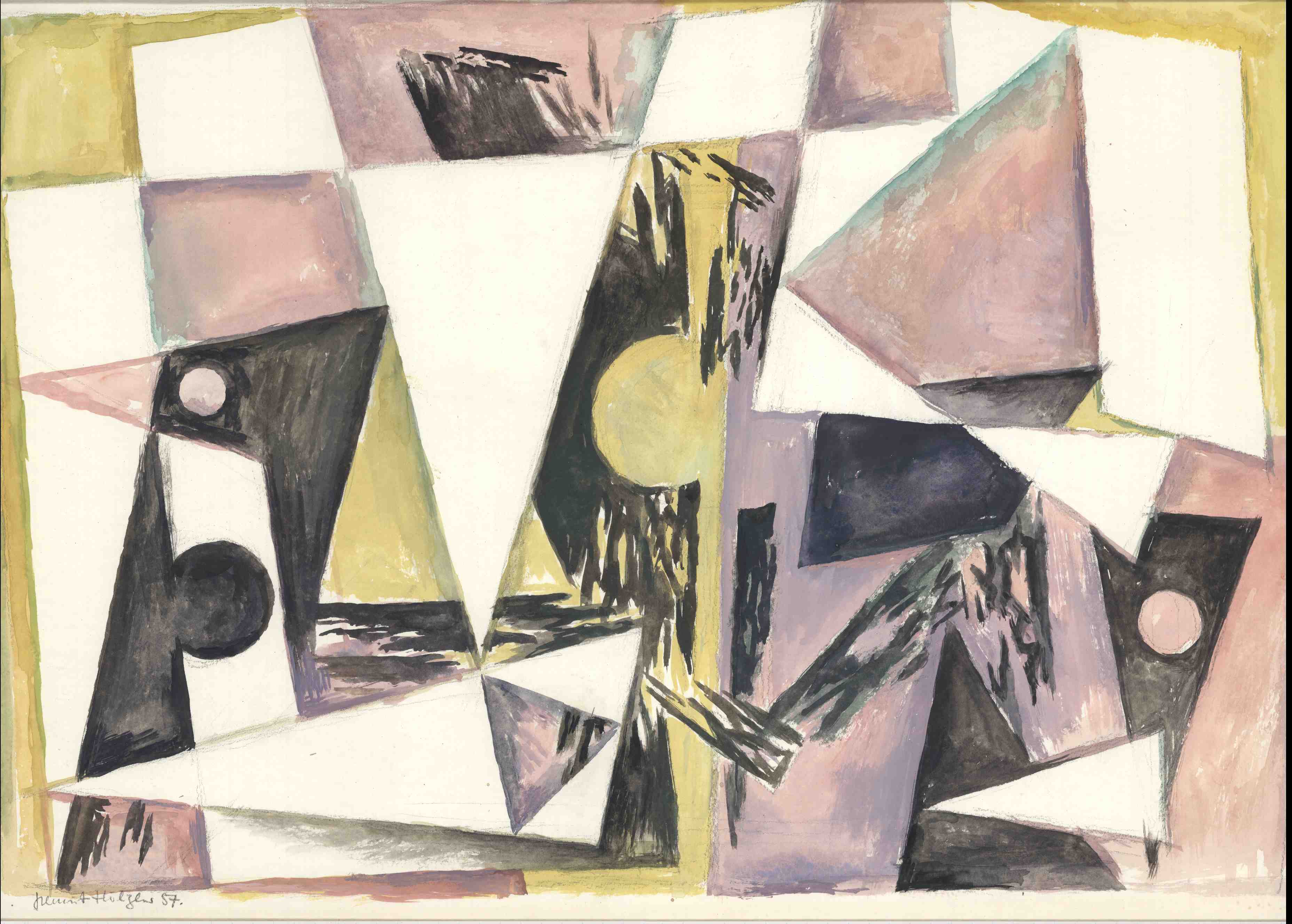 Flächige Strukturen lösen das Spitze ab. Diese Flächen erhalten wenig später ein Zentrum – das „Aufbrechende“ ist im Namen dieses Werks enthalten.