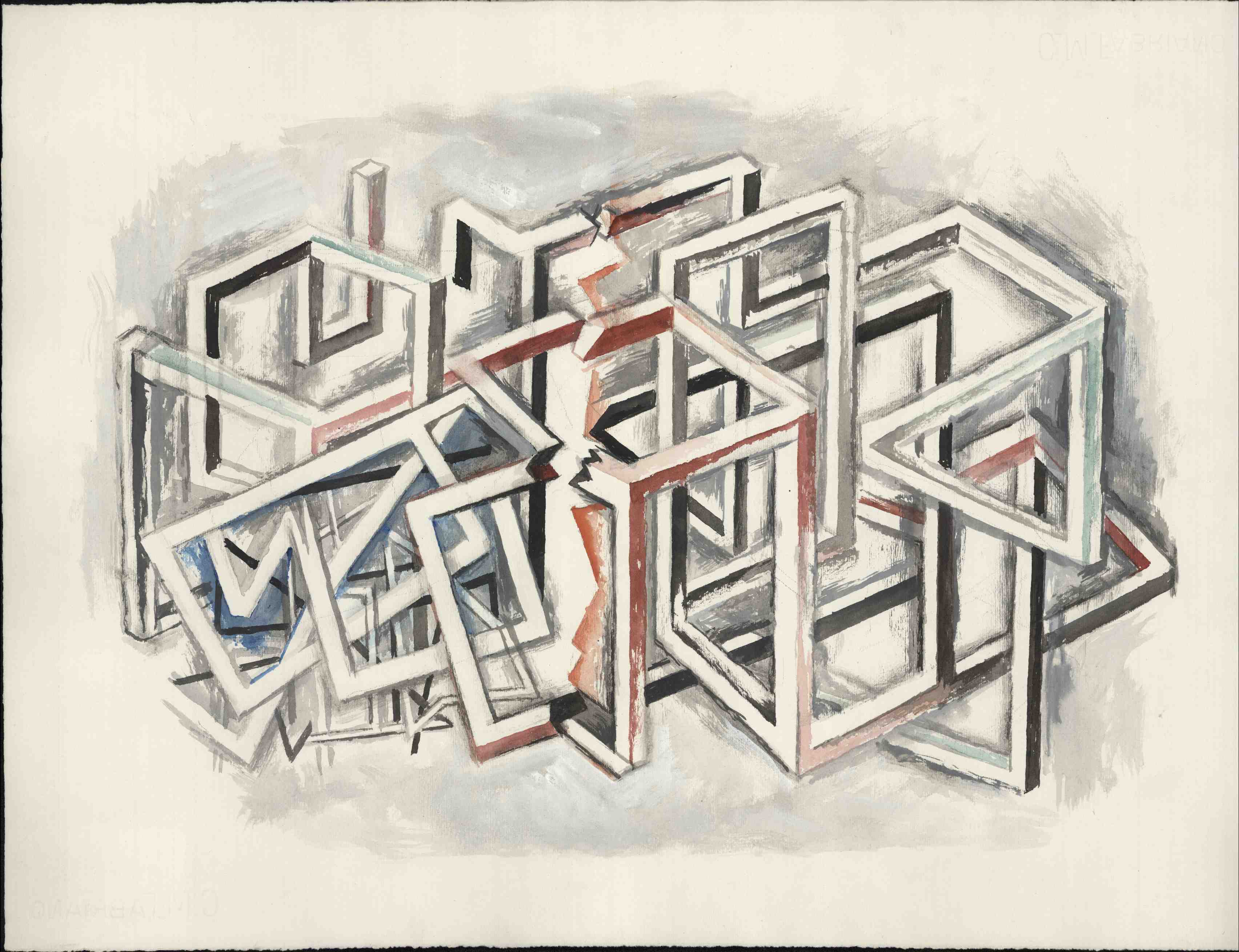 Spielerisch greift der Künstler Elemente auf, die M.C. Escher drei Jahre zuvor, auf einem Mathematiker-Kongress 1954 gezeigt hat. Das Penrose-Dreieck ist rechts deutlich erkennbar.