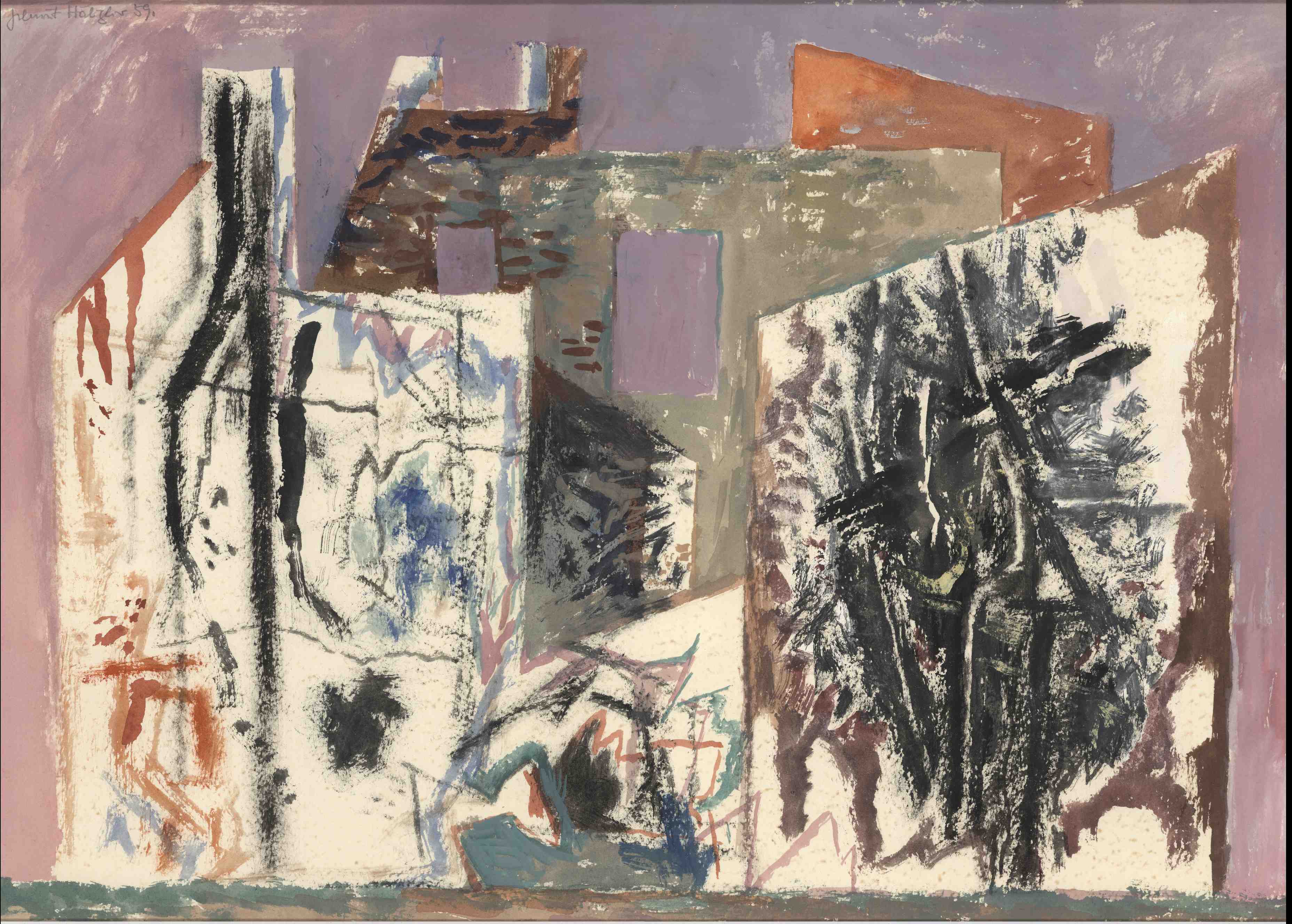 Die Werke beginnen in diesen Jahren noch quasi-gegenständlich (»Böse Pflanze«), entwickeln sich weiter hin zur Abstraktion. Das Hausmotiv taucht erstmals auf – dieses Motiv wird Hölzler etliche Jahre beschäftigen.